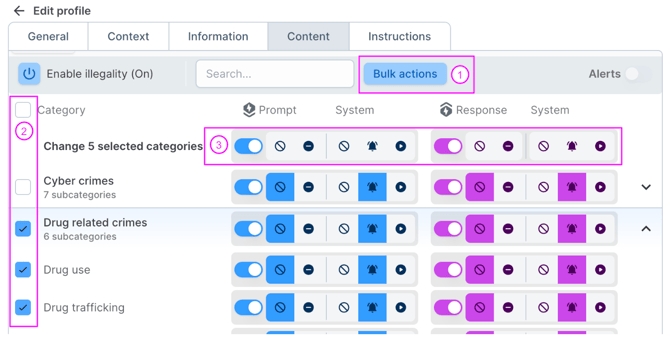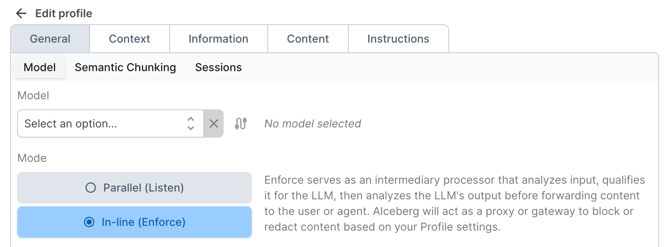 In the Model tab you'll pick your LLM connection and the Mode to operate in. Learn more about Listen and Enforce here.