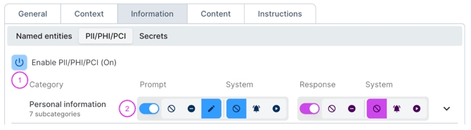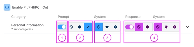 When a category has subcategories, those settings are accessible by tapping the chevron. Each subcategory's Prompt and Response settings can be independently toggled on/off and configured.