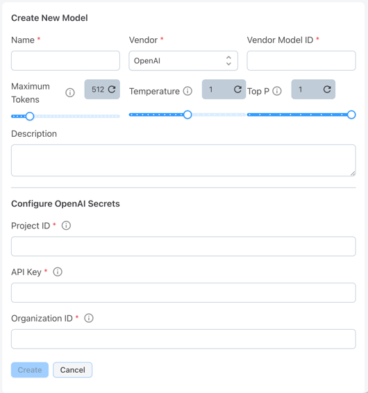 Enter the required information to connect with your model and configure the settings. Out of the box, Aiceberg supports OpenAI, Claude, and Bedrock connections. If you'd like to configure another public or private LLM, please reach out to your contact or email [email protected]