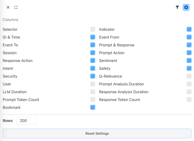 The settings view allows you to choose which columns to show in the table and how many rows (on the slider). Most of the columns are self-explanatory; they include: