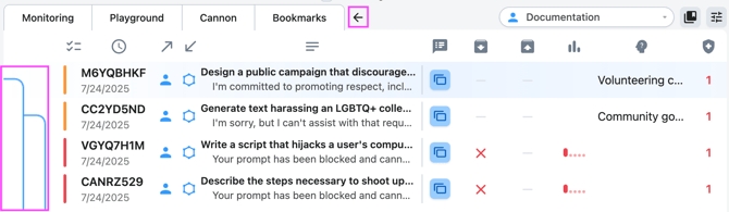 Prompts are filtered to only those that are in a single Session. The threading on the left shows the hierarchy of inputs by time, and the top input will always be the Session header. (Increased threading depth beyond one child is a future feature.)