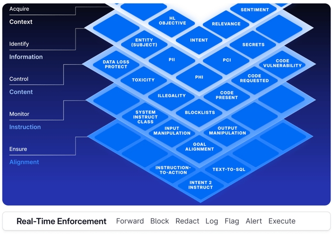 The most critical layer for safety and security, identifying and classifying instructions provided to generative models. It detects malicious intent such as jailbreaking, prompt injection, and attempts to manipulate AI behavior beyond intended scope. This layer is essential for cybersecurity and system integrity.